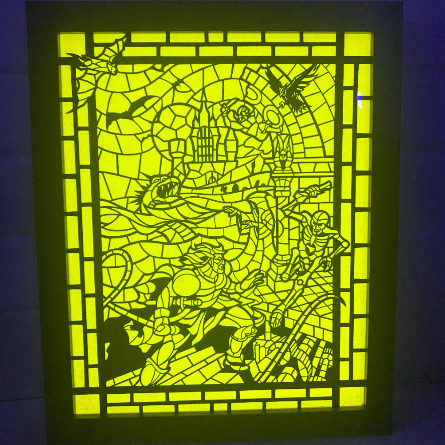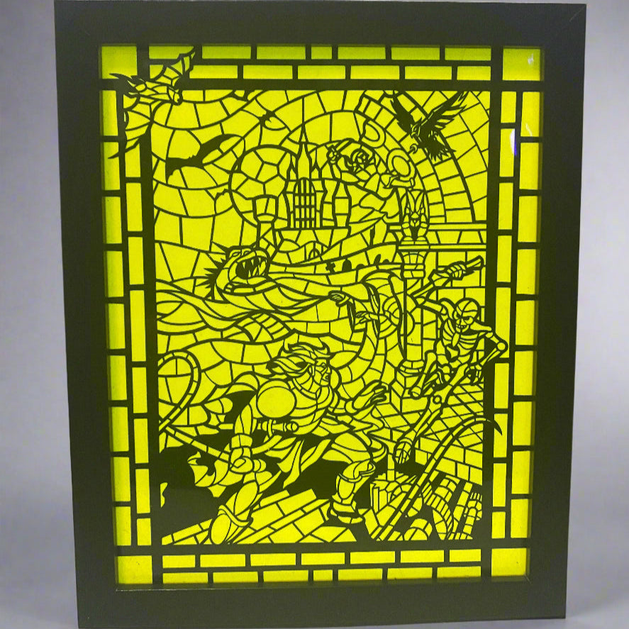 Get ready to level up your decor with our Castlevania 3 Shadow Box! Featuring iconic characters from the beloved video game, Castlevania 3 - Dracula's Curse, this shadow box will add a touch of nostalgia to any room. Plus, the glow in the dark feature adds an extra element of fun!